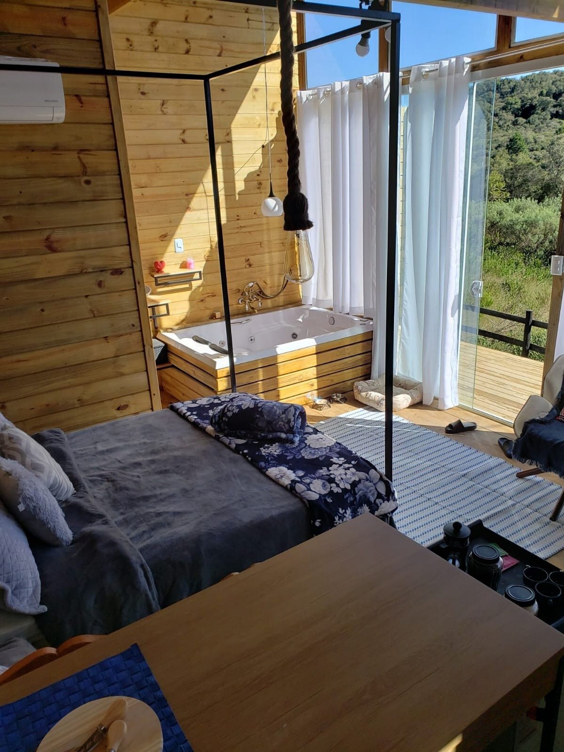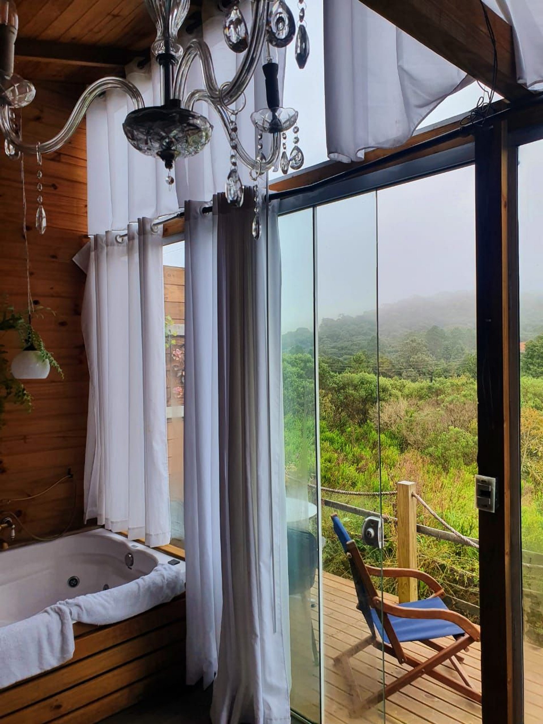 Nosso segundo chale tem banheira dupla de hidromassagem com cromoterapia, lareira, aquecimento e todo conforto que merecem, além de todo carinho que temos para te receber. Ah, e muito, muito vidro para que tenham uma vista incrível da natureza ao acordarem e contemplem as estrelas ao dormirem. Estamos a 09km do Centro de Rancho Queimado, na localidade da Queimada Grande, rodeados por natureza, pássaros e boas energias.